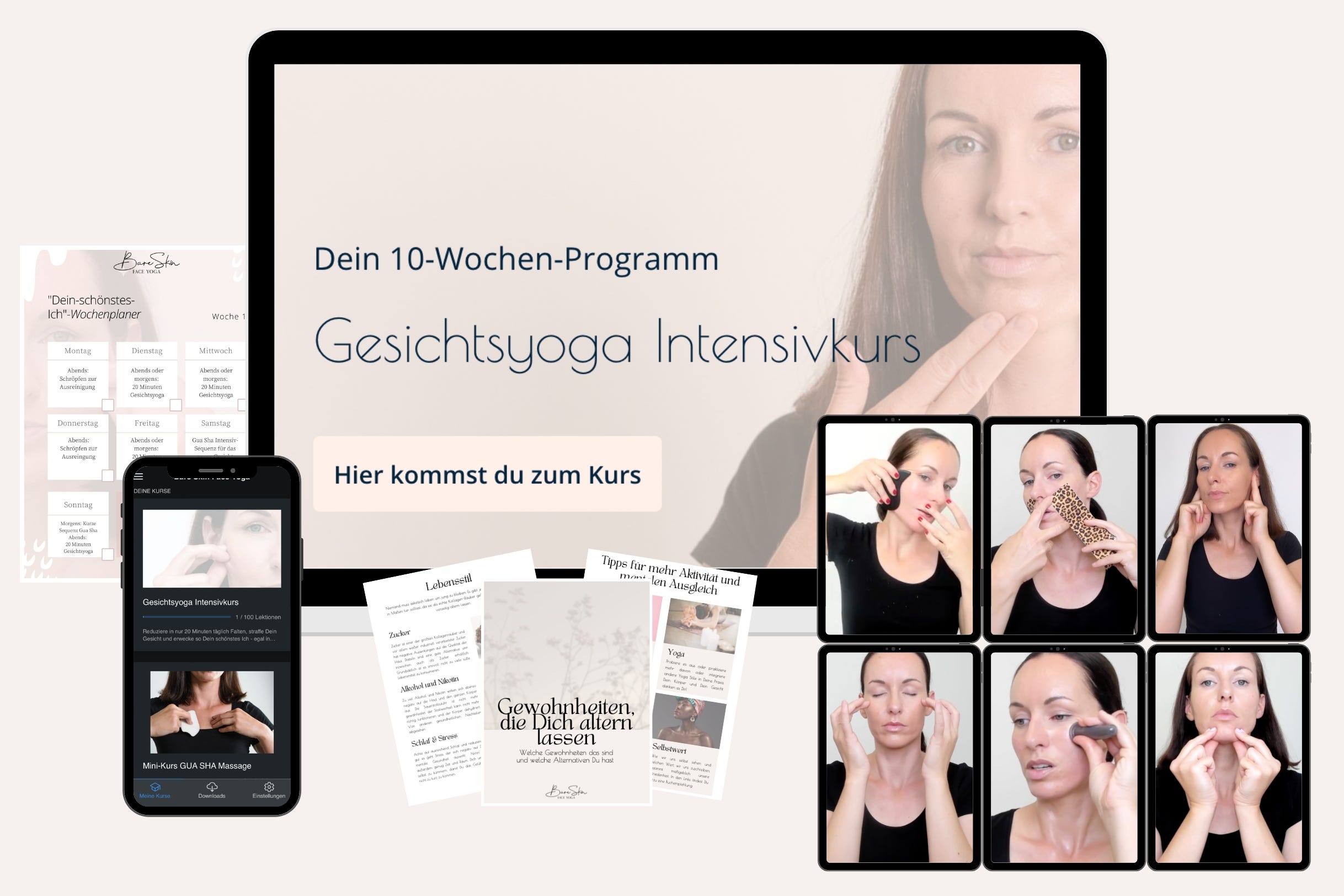 Zusätzlich bekommst Du Videos zur Anwendung mit dem Gesichtsroller, gegen Asymmetrien, die Dein Gesicht schief erscheinen lassen, Übungen ohnen Hände, die Du immer und überall machen kannst sowie das E-Book "Gewohnheiten, die Dich altern lassen" und den Gesichtsyoga Wochenplan zum Downloaden!
