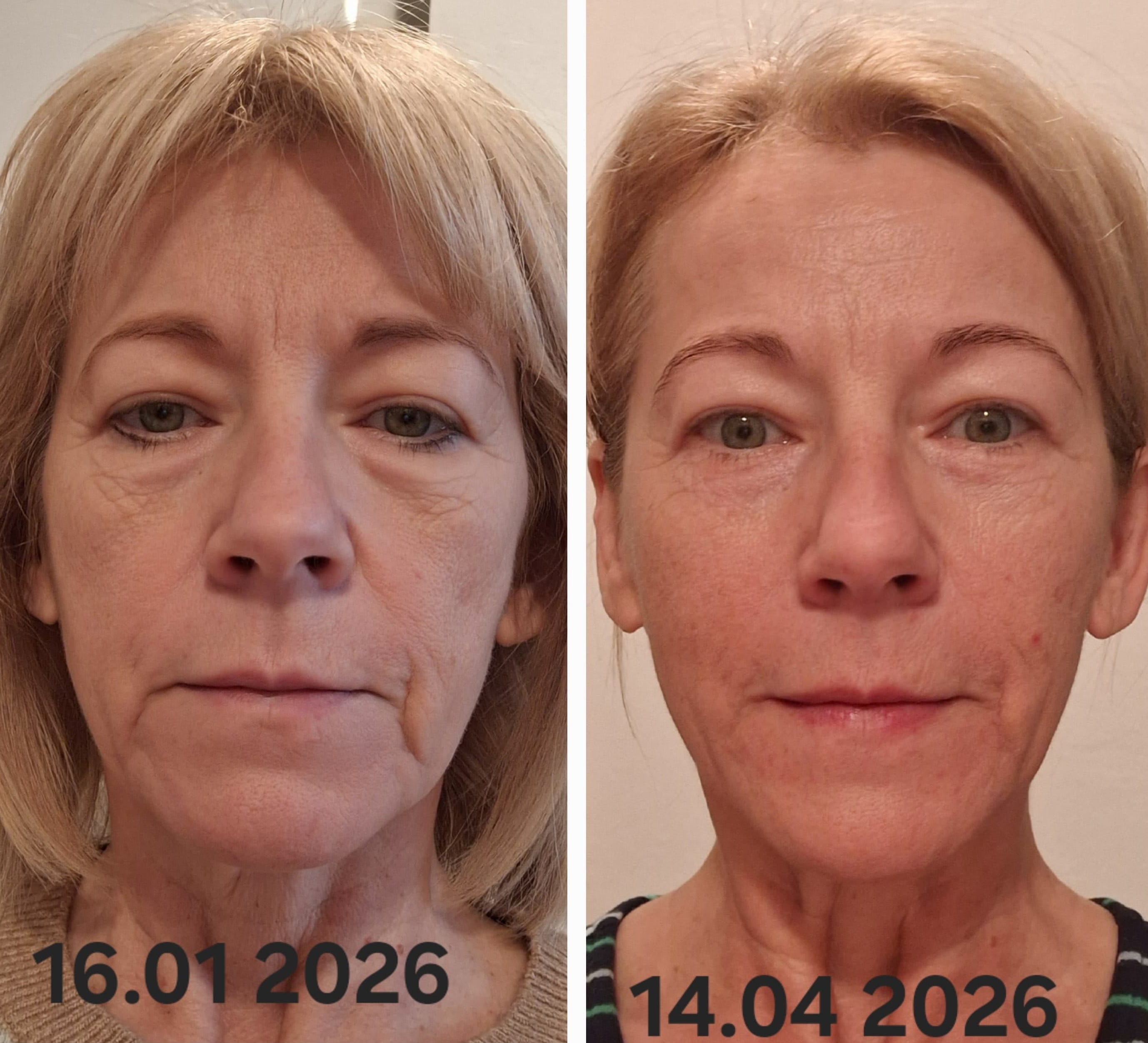 Meine Stirnfalten sind deutlich weniger geworden, auch die Krähenfüße. Die Augenlider sind sehr tagesabhängig. Insgesamt ist mein Gesicht morgens weniger geschwollen, und ich fühle mich dem Allterungsprozess nicht mehr so hilflos ausgeliefert. Das beruhigt mich ungemein.