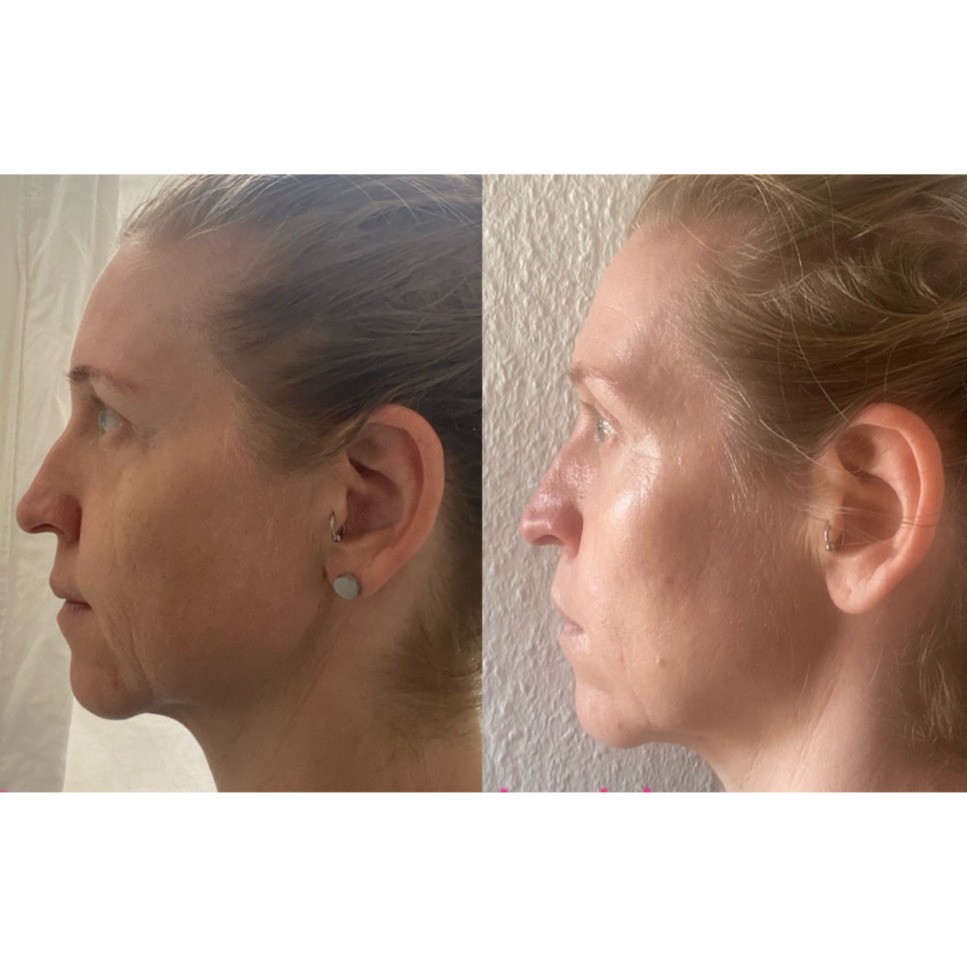 Mein Gesicht sieht praller, frischer und gestraffter aus. So manches Fältchen hat sich verringert. Meine Intention war es nicht mich zu verjüngen ich wollte nur der Vertiefung bzw. Entwicklung weiterer Falten entgegen wirken. Nicht zu vergessen es macht auch richtig viel Spaß.