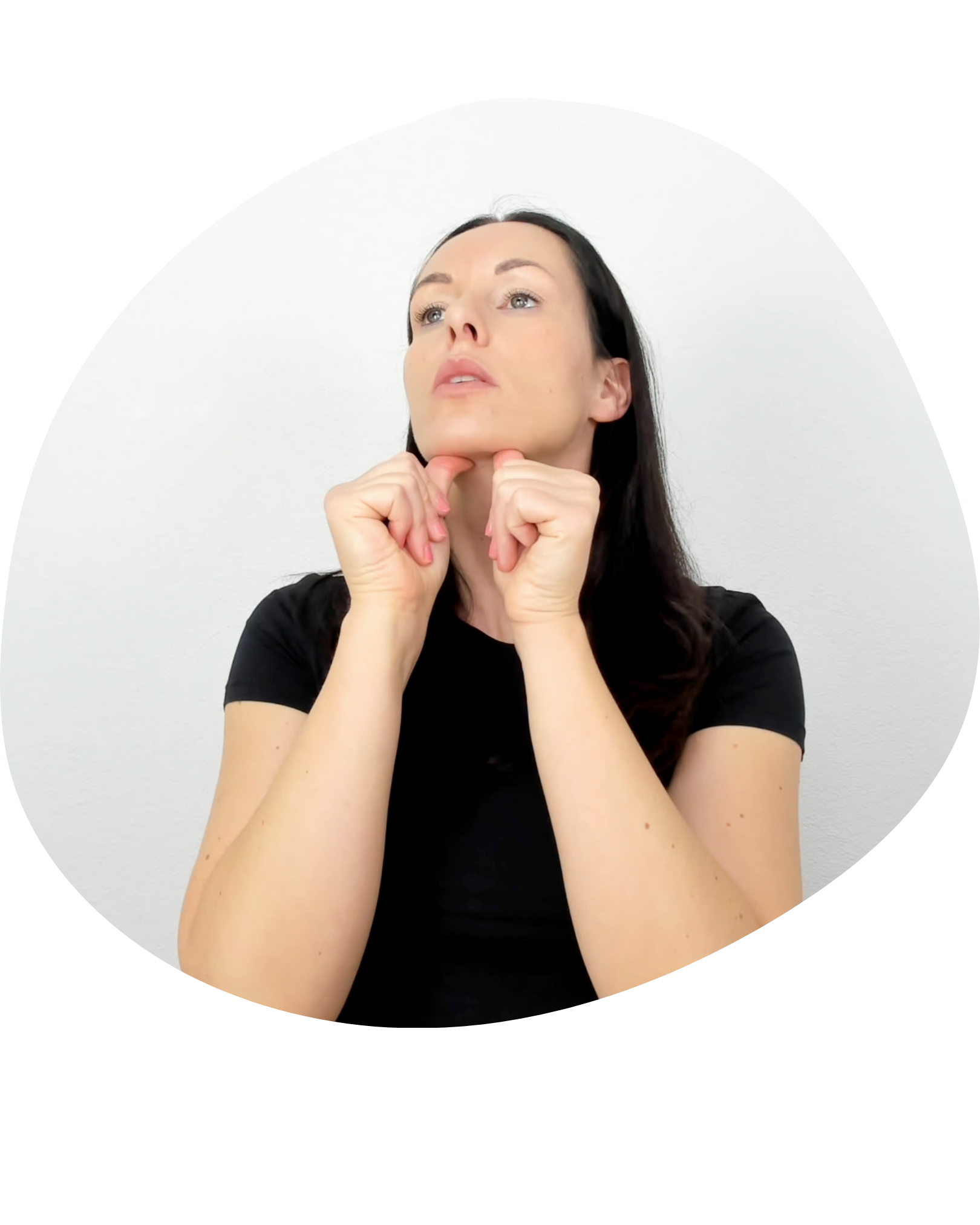 Du definierst mit gezielten Handgriffen Deine Kinnlinie und arbeitest gegen Marionettenfalten. Zudem straffst und verlängerst Du nicht nur den Hals, sondern Du reduzierst auch Dein Doppelkinn.